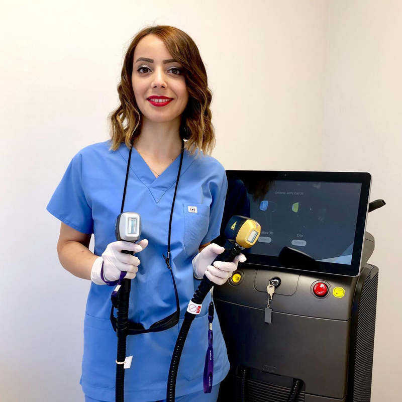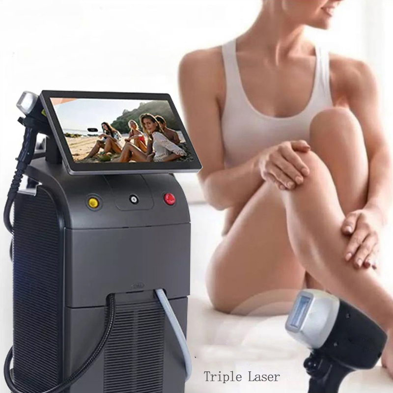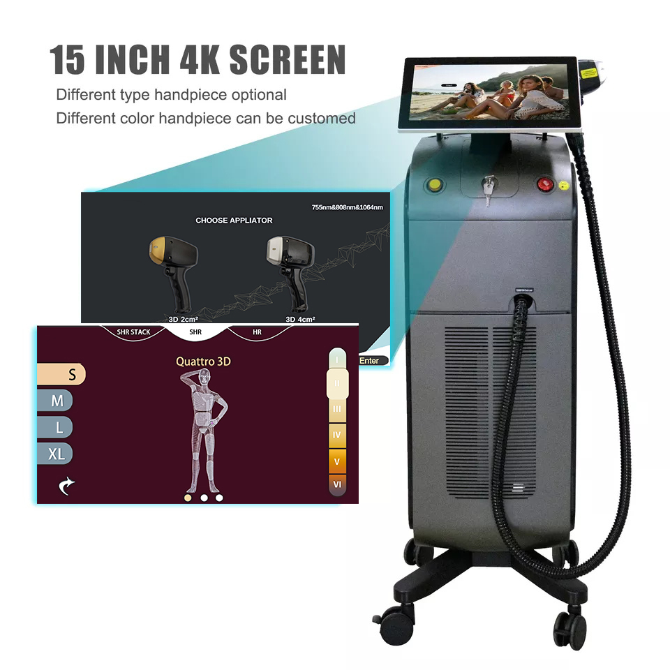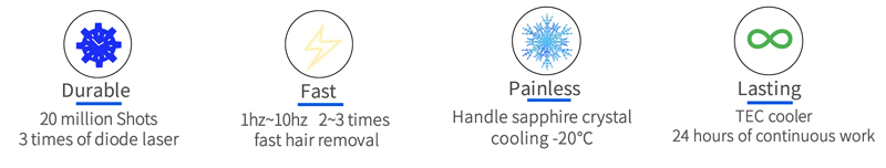 Except for the 810nm handle, the new Trio handle combines 755/810/1064nm wavelength into a single hand piece. It releases triple wavelength laser simultaneously to target different depth of hair follicle. The benifit of 3 wavelengths are utilized for optimum coverage and penetration to reach a ultimate hair removal result. The enlarged spot size achieves faster treatment and saves operators' time.