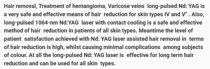 7. The long-pulsed 1064-nm Nd: YAG laser with contact cooling is a safe and effective method of hair reduction in patients of all skin types. Side effects were limited and transient.